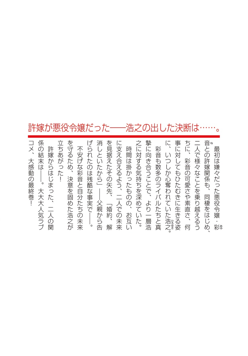 最初は嫌々だった悪役令嬢・彩音との許嫁関係も、同棲をはじめ、2人で様々なことを乗り越えるうちに、彩音の可愛さや素直さ、何事に対してもひたむきに生きる姿に、いつしか心奪われていた浩之。