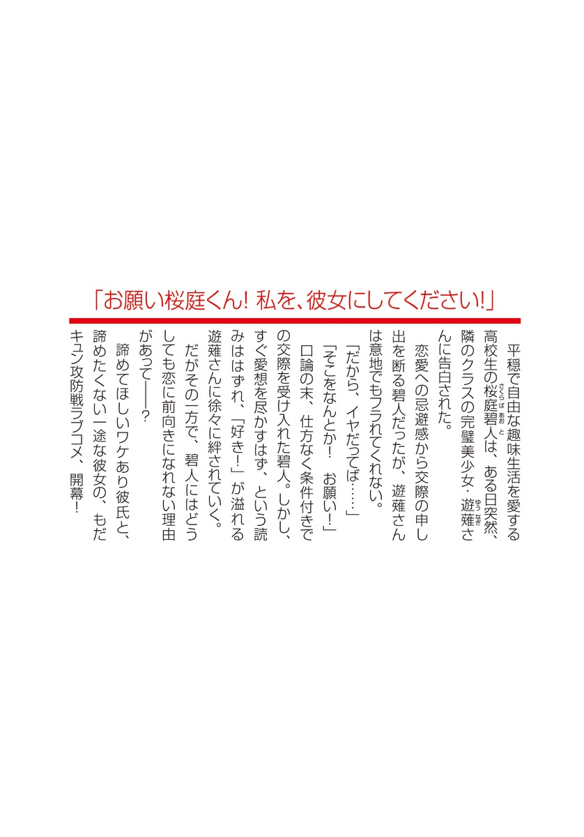 平穏で自由な趣味生活を愛する高校生の桜庭碧人は、ある日突然、隣のクラスの完璧美少女・遊薙さんに告白された。