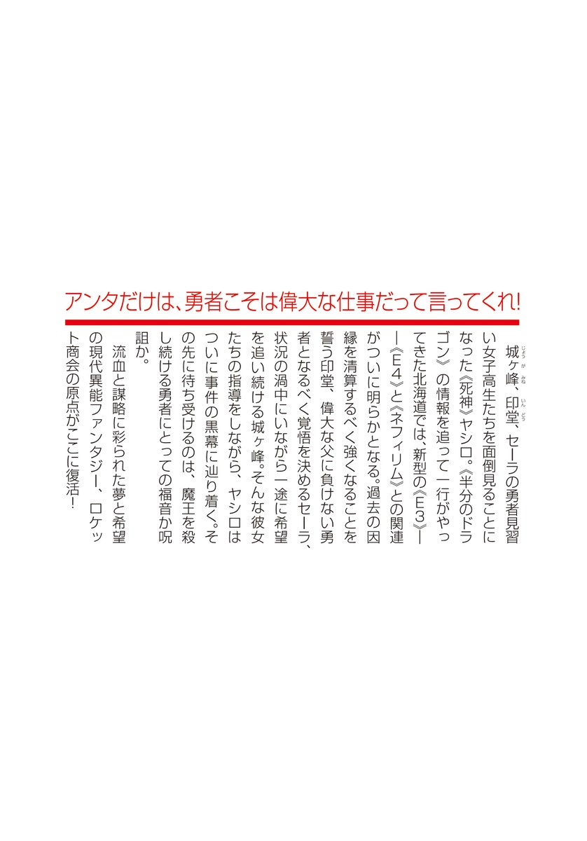 《半分のドラゴン》の情報を追って一行がやってきた北海道では、新型の《E3》――《E4》と《ネフィリム》との関連がついに明らかとなる。