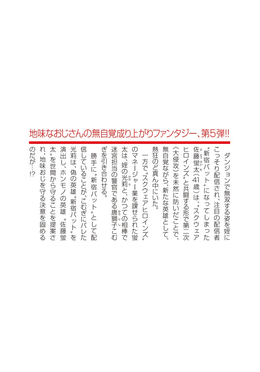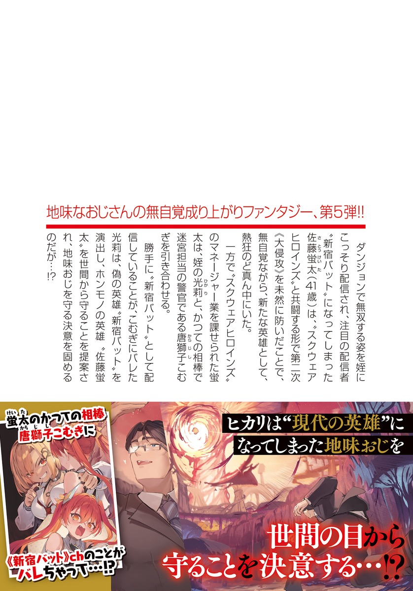 ダンジョンで無双する姿を姪にこっそり配信され、注目の配信者“新宿バット”になってしまった佐藤蛍太(41歳)は、“スクウェアヒロインズ”と共闘する形で第二次《大侵攻》を未然に防いだことで、無自覚ながら、新たな英雄として、熱狂のど真ん中にいた。