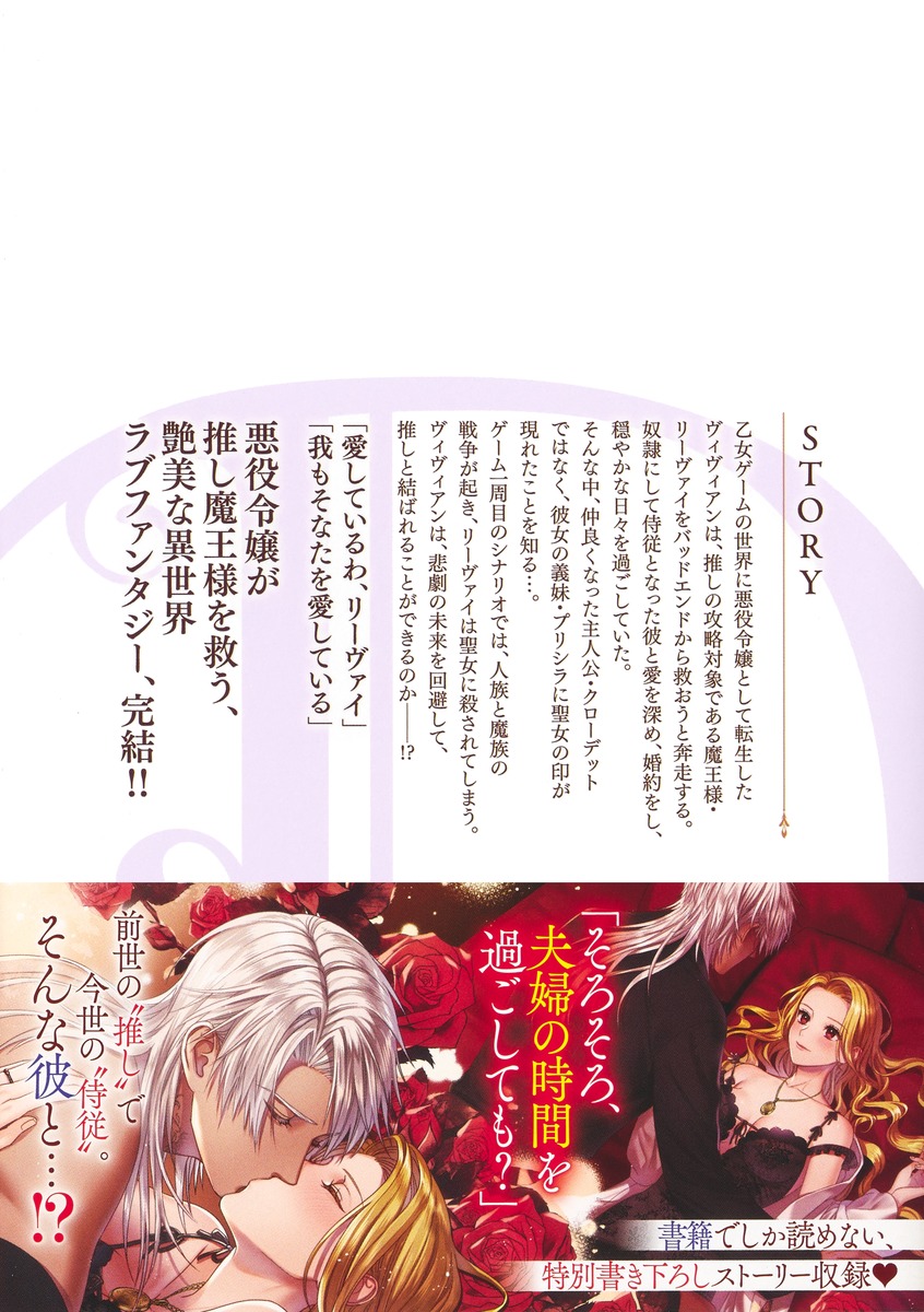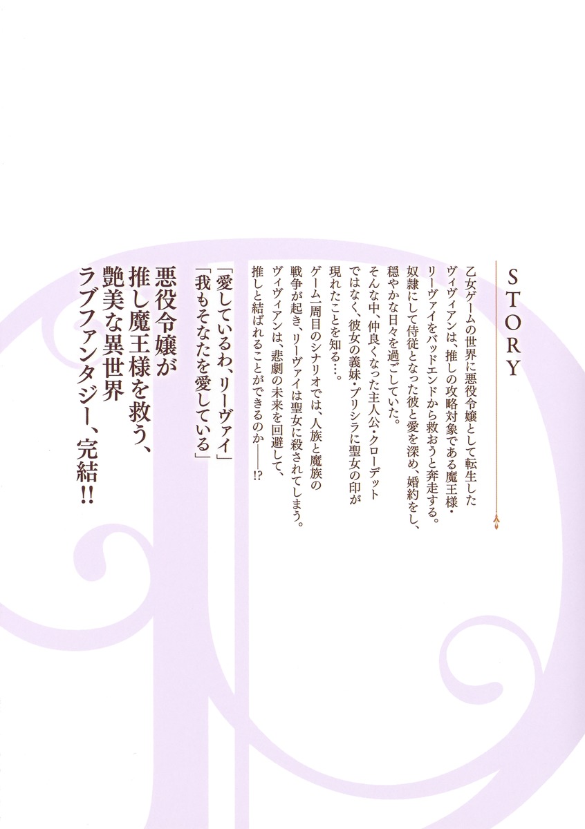 乙女ゲームの世界に悪役令嬢として転生したヴィヴィアンは、推しの攻略対象である魔王様・リーヴァイをバッドエンドから救おうと奔走する。奴隷にして侍従となった彼と愛を深め、婚約をし、穏やかな日々を過ごしていた。