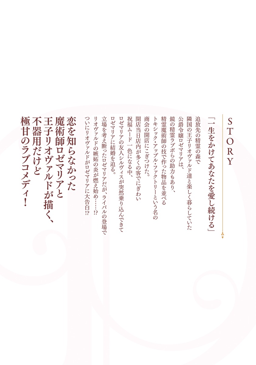 追放先の精霊の森で隣国の王子リオヴァルド達と楽しく暮らしていた公爵令嬢ロゼマリアは、鏡の精霊ラブボらの助力もあり、精霊魔術師の技で作った物品を並べるトキシック・アップル・ファクトリーという名の商会の開店にこぎつけた。