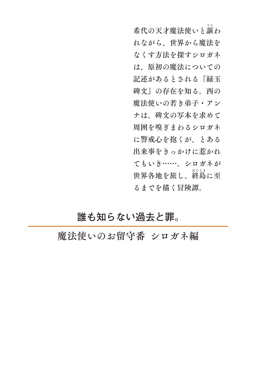 希代の天才と称されし、不老で美貌の魔法使い──シロガネ。魔女の生贄となった幼馴染のマホロを救うため、世界から魔法をなくす方法を探すうち、原初の魔法についての記述があるとされる『緑玉碑文』の存在を知る。碑文の写本を持つ西の魔法使い・ミロクを尋ねて黄金の谷間を訪れたシロガネに対し、ミロクの弟子であるアンナは不信感を抱きつつもどこか惹かれていくが……。シロガネが世界各地を旅するうちに名声を得て大魔法使いと呼ばれ、終島に至るまでを描く『魔法使いのお留守番』シリーズ過去編。