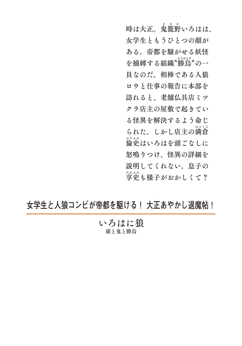 祖父と暮らす鬼籠野いろはは、名門女学校の生徒という以外に、もうひとつの顔があった。帝都を騒がせる妖怪を捕縛する組織“勝烏”の一員なのだ。相棒である人狼ロウと仕事の報告に本部を訪れると、老舗仏具店ミツクラ店主の屋敷で起きている怪異を解決するよう命じられた。しかし店主の満倉倫史はいろはを頭ごなしに怒鳴りつけ、怪異の詳細を説明してくれない。息子の享史も様子がおかしくて…?