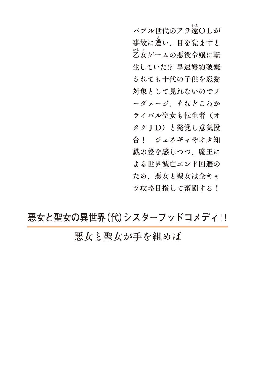 バブル世代のアラ還OLが事故に遭い、目を覚ますと乙女ゲームの悪役令嬢・エレノアに転生していた!? 皇太子に早速婚約破棄されても、十代の子供を恋愛対象として見れないのでノーダメージ。それどころかライバル聖女・ルミエラも転生者(元オタク女子大生)と発覚し、世代を超えて意気投合! ゲーム知識は豊富な代わりに恋愛経験ゼロのルミエラを、長年の社会人スキルとバブル時代にブイブイ言わせた経験でサポートするうち、悪女のはずがイケメンキャラ達になぜか次々と好かれていくエレノア。世界滅亡バッドエンドを回避するためには魔王を含めた全キャラ攻略が必須だと判明し……!? 昭和ネタ満載の新感覚異世界(代)シスターフッドコメディ!!