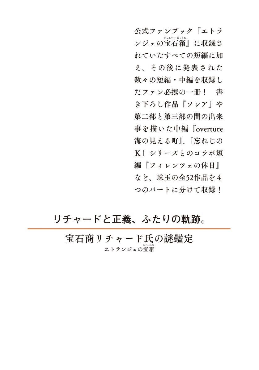 2019年に刊行された公式ファンブック『エトランジェの宝石箱』に収録されていたすべての短編に加え、その後に発表された数々の短編・中編を収録したファン必携の一冊! 書き下ろし作品『ソレア』や第二部と第三部の間の出来事を描いた中編『overture 海の見える町』、「忘れじのK」シリーズとのコラボ短編『フィレンツェの休日』など、珠玉の全52作品を4つのパートに分けて収録!