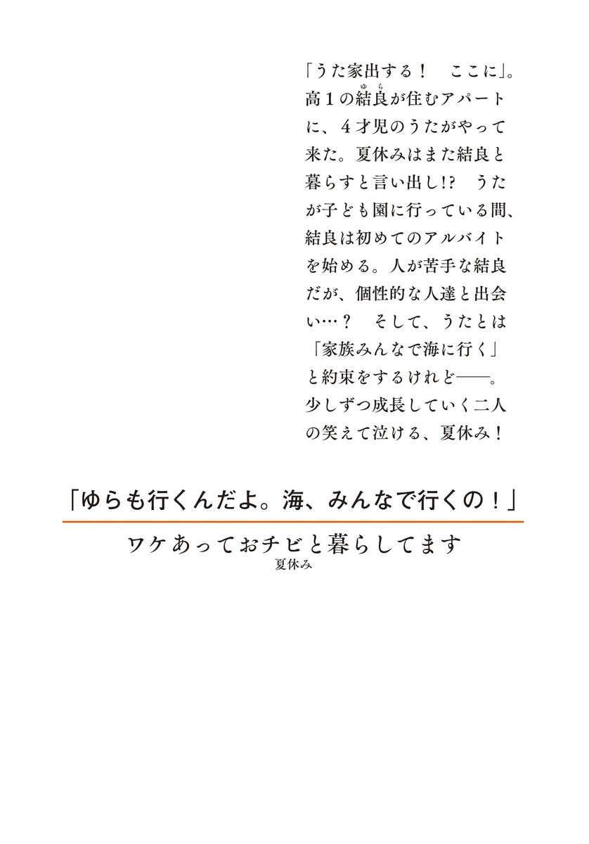 可愛くって、可笑しくって、じんとくる!無愛想男子×自由すぎる4才児、二人暮らしの夏休み「いいこと考えたっ。うた家出する! ここに」。高1の結良(ゆら)が住むアパートに、4才児のうたがやって来た。夏休みは友達のつむちゃんと遊びたいから、また結良と暮らすと言い出し!? うたが子ども園に行っている間、結良は初めてのアルバイトを始める。人が苦手な結良だが、個性的なバイト仲間や店長と出会い…? そして、うたとは「家族みんなで海に行く」と約束をするけれど――。少しずつ成長していく二人の笑えて泣ける、夏休み!