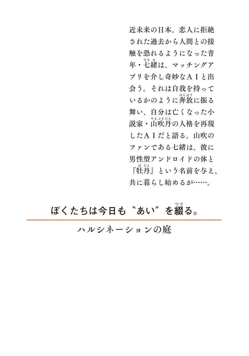 今より少し先の未来の日本。恋人に拒絶された過去から人間との接触を恐れるようになった青年・七緒は、マッチングアプリを介し奇妙な AI と出会う。それは自我を持っているかのように奔放に振る舞い、自分は亡くなった小説家・山吹丹の人格を再現したAIだと語る。山吹丹のファンである七緒は偶然の出会いに驚きつつもそのAI に惹かれ、彼に男性型アンドロイドの体と『牡丹』という名前を与えて共に暮らし始める。