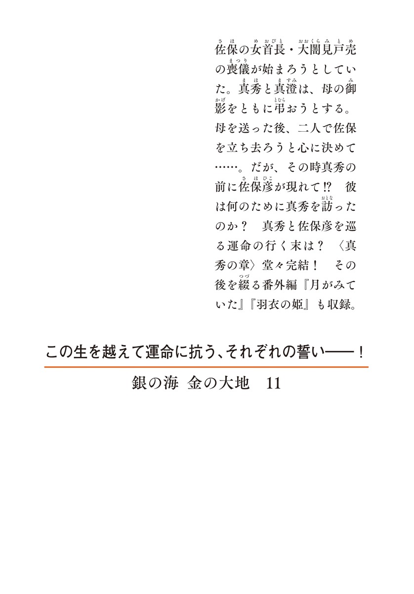本編のその後を綴る番外編『月がみていた』、『「銀の海 金の大地」イラスト集』にのみ掲載された短編『羽衣の姫』も収録。