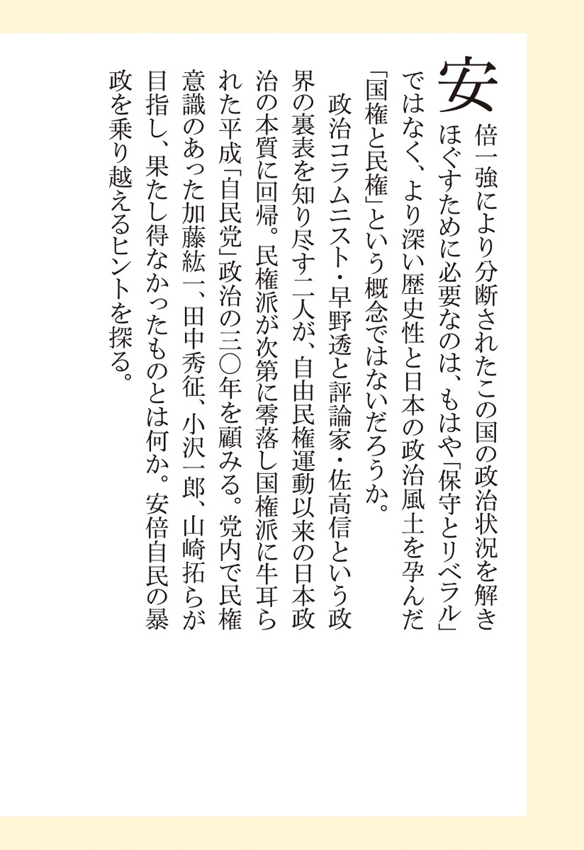 長年、朝日新聞の政治記者として厳しい政治の現場に立ち会ってきた政治コラムニスト・早野透と、国権の横暴に異を唱え続ける評論家・佐高信という、政界の裏表を知り尽す二人が、国家と民衆が真摯に対峙した自由民権運動以来の日本政治の本質に立ち返り、民権派が次第に零落し、国権派に牛耳られた平成「自民党」政治の30年を顧みる。