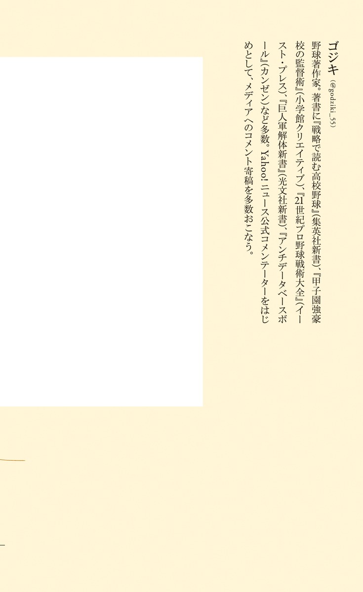 野球著作家。著書に『戦略で読む高校野球』(集英社新書)、『甲子園強豪校の監督術』(小学館クリエイティブ)、『21世紀プロ野球戦術大全』(イースト・プレス)、『巨人軍解体新書』(光文社新書)、『アンチデータベースボール』(カンゼン)など多数。Yahoo!ニュース公式コメンテーターをはじめとして、メディアへのコメント寄稿を多数おこなう。