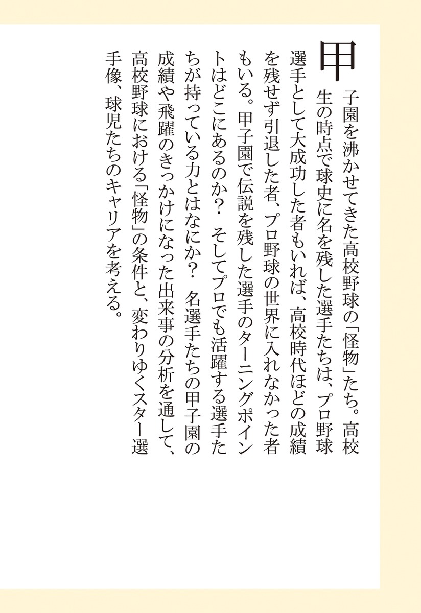 甲子園を沸かせてきた高校野球の「怪物」たち。高校生の時点で球史に名を残した選手たちは、プロ野球選手として大成功した者もいれば、高校時代ほどの成績を残せず引退した者、プロ野球の世界に入れなかった者もいる。甲子園で伝説を残した選手のターニングポイントはどこにあるのか? そしてプロでも活躍する選手たちが持っている力とはなにか?名選手たちの甲子園の成績や飛躍のきっかけになった出来事の分析を通して、高校野球における「怪物」の条件と、変わりゆくスター選手像、球児たちのキャリアを考える。