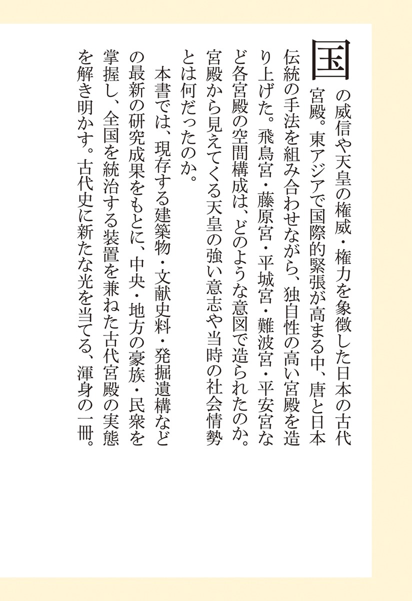本書では、現存する建築物・文献史料・発掘遺構などの最新の研究成果をもとに、中央・地方の豪族・民衆を掌握し、全国を統治する装置を兼ねた古代宮殿の実態を解き明かす。