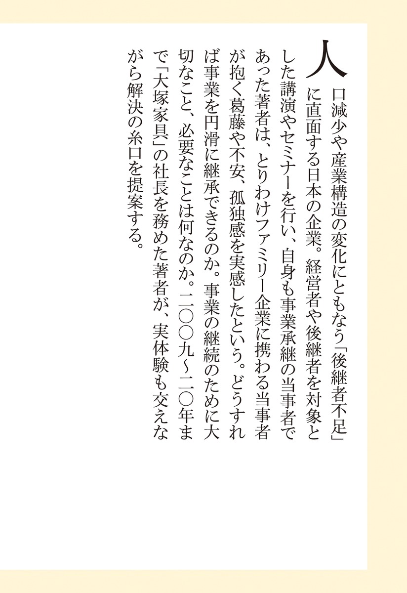 経営者や後継者を対象とした講演やセミナーを行い、自身も事業承継の当事者であった著者は、とりわけファミリー企業に携わる当事者が抱く葛藤や不安、孤独感を実感したという。