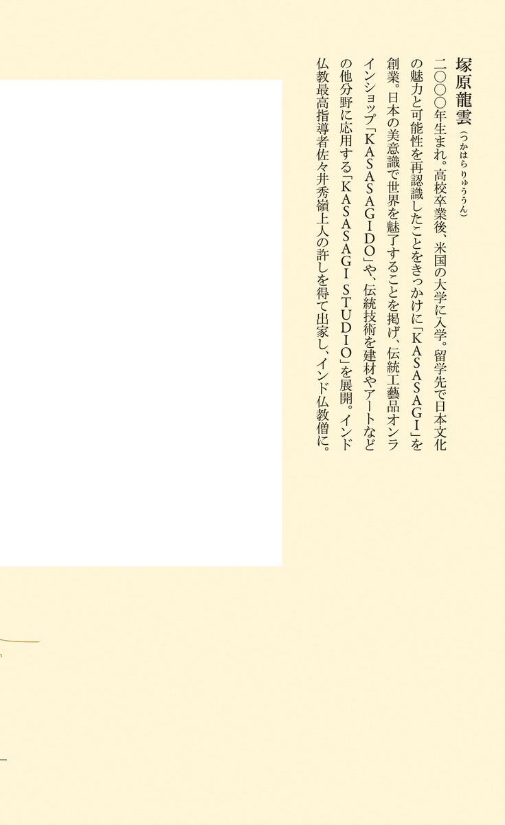2000年生まれ。高校卒業後、米国の大学に入学。留学先で日本文化の魅力と可能性を再認識したことをきっかけに「KASASAGI」を創業。日本の美意識で世界を魅了することを掲げ、伝統工藝品オンラインショップ「KASASAGIDO」や、伝統技術を建材やアートなどの他分野に応用する「KASASAGI STUDIO」を展開。インド仏教最高指導者佐々井秀嶺上人の許しを得て出家し、インド仏教僧に。