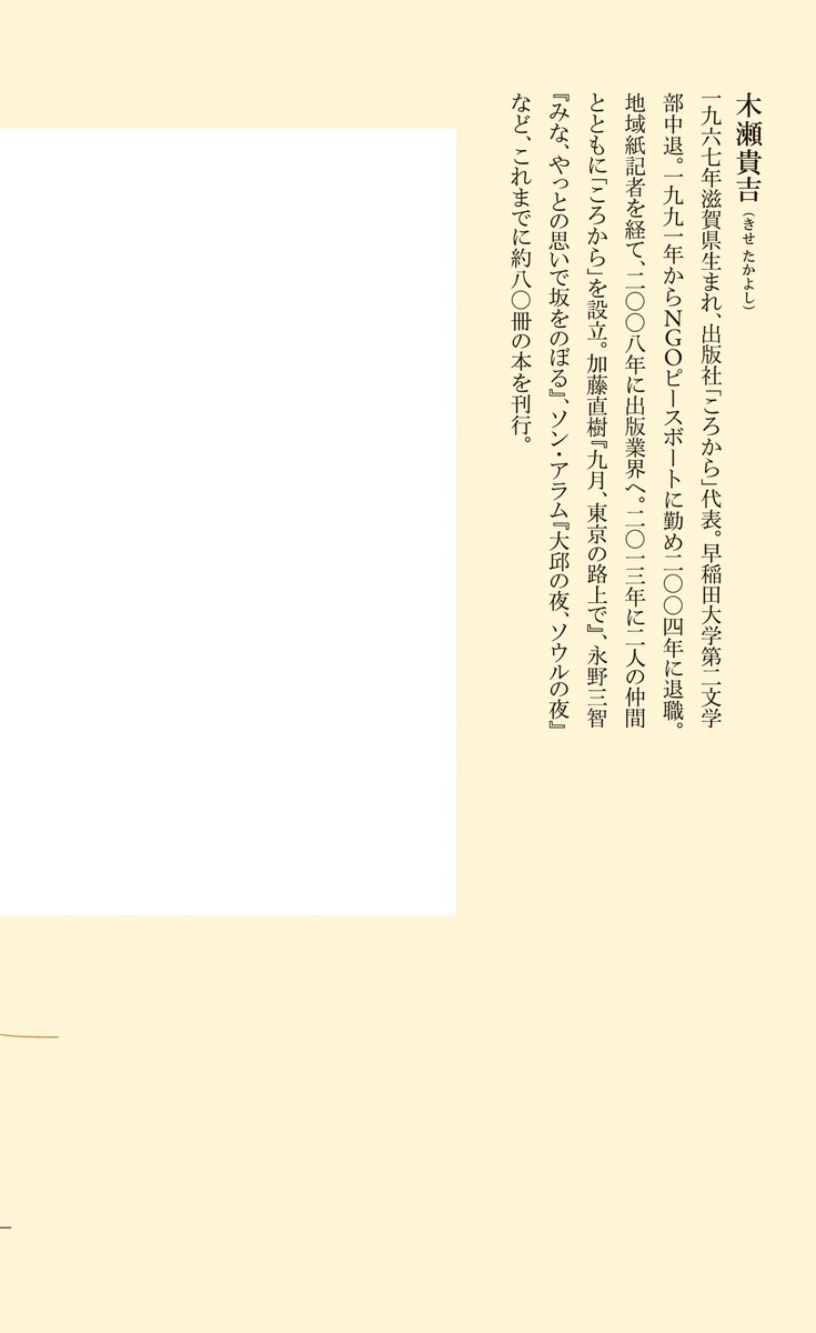 1967年滋賀県生まれ、出版社「ころから」代表。早稲田大学第二文学部中退。1991年からNGOピースボートに勤め2004年に退職。地域紙記者を経て、2008年に出版業界へ。2013年に二人の仲間とともに「ころから」を設立。加藤直樹『九月、東京の路上で』、永野三智『みな、やっとの思いで坂をのぼる』、ソン・アラム『大邸の夜、ソウルの夜』など、これまでに約80冊の本を刊行。