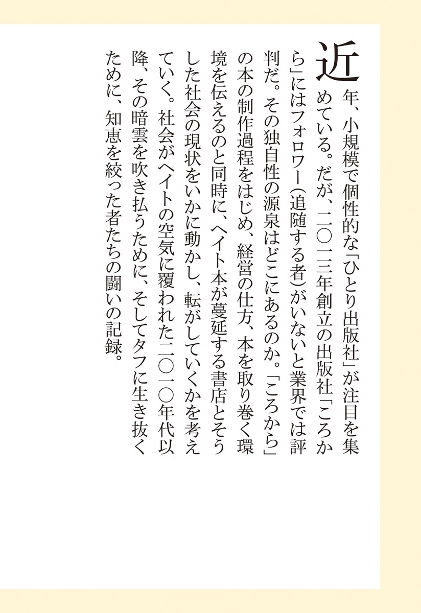 その独自性の源泉はどこにあるのか。「ころから」の本の制作過程をはじめ、経営の仕方、本を取り巻く環境を伝えるのと同時に、ヘイト本が蔓延する書店とそうした社会の現状をいかに動かし、転がしていくかを考えていく。社会がヘイトの空気に覆われた2010年代以降、その暗雲を吹き払うために、そしてタフに生き抜くために、知恵を絞った者たちの闘いの記録。