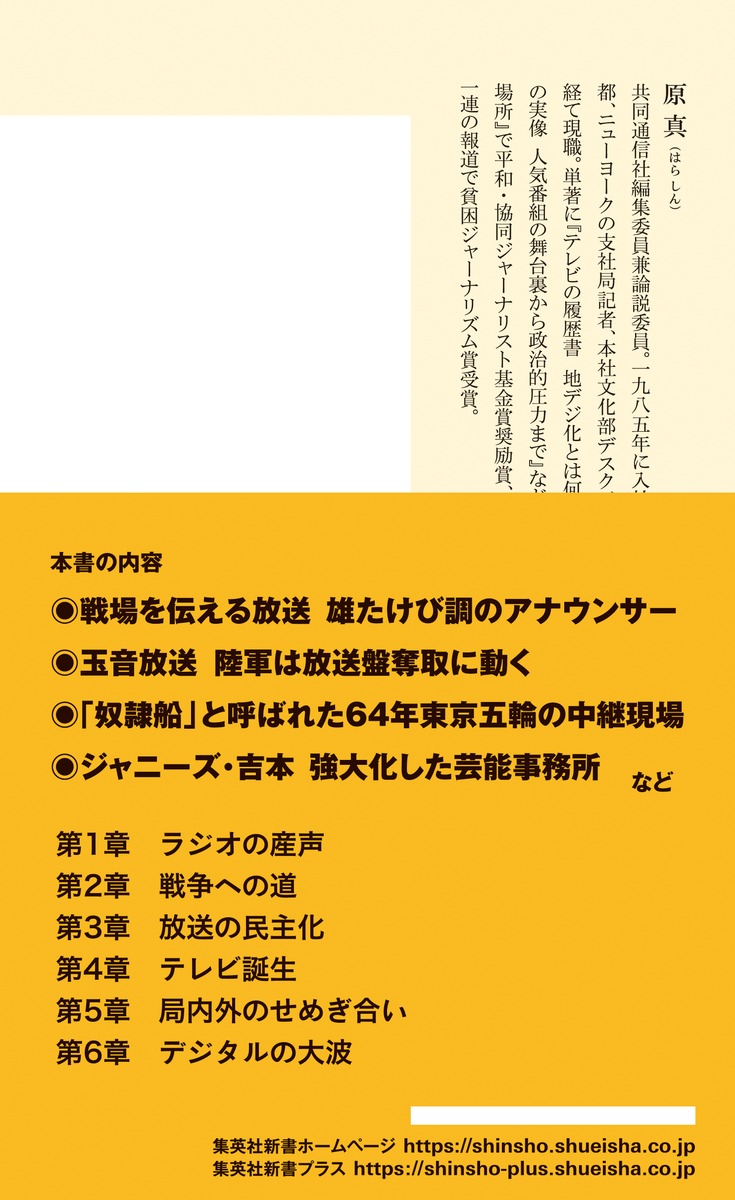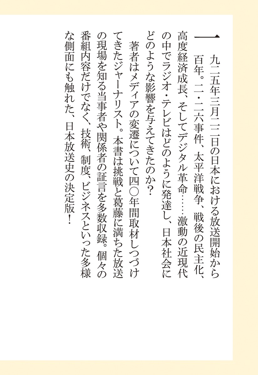 著者はメディアの変遷について40年間取材しつづけてきたジャーナリスト。本書は挑戦と葛藤に満ちた放送の現場を知る当事者や関係者の証言を多数収録。個々の番組内容だけでなく、技術、制度、ビジネスといった多様な側面にも触れた、日本放送史の決定版!