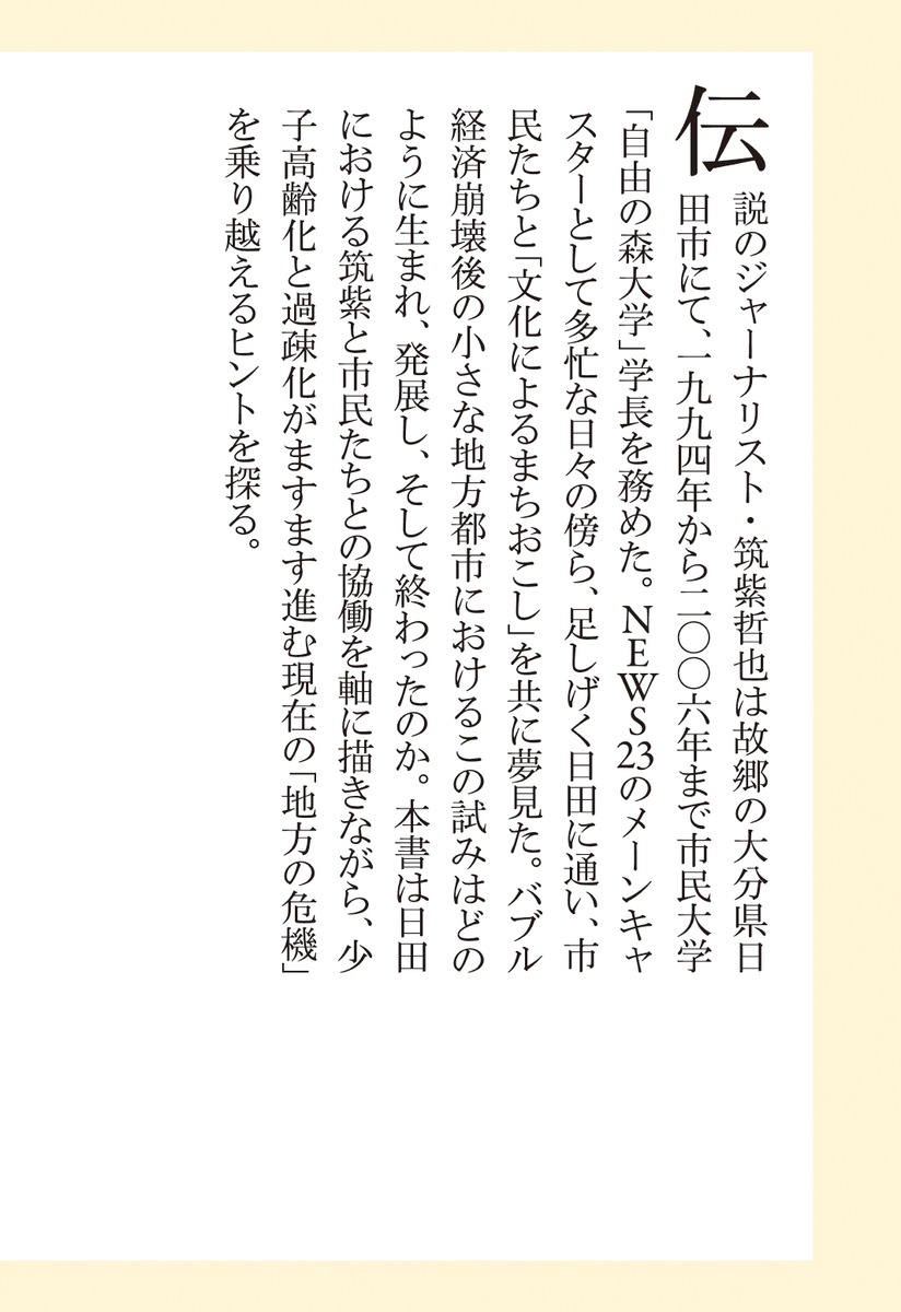 本書は日田における筑紫と市民たちとの協働を軸に描きながら、少子高齢化と過疎化がますます進む現在の「地方の危機」を乗り越えるヒントを探る。佐高信氏推薦!