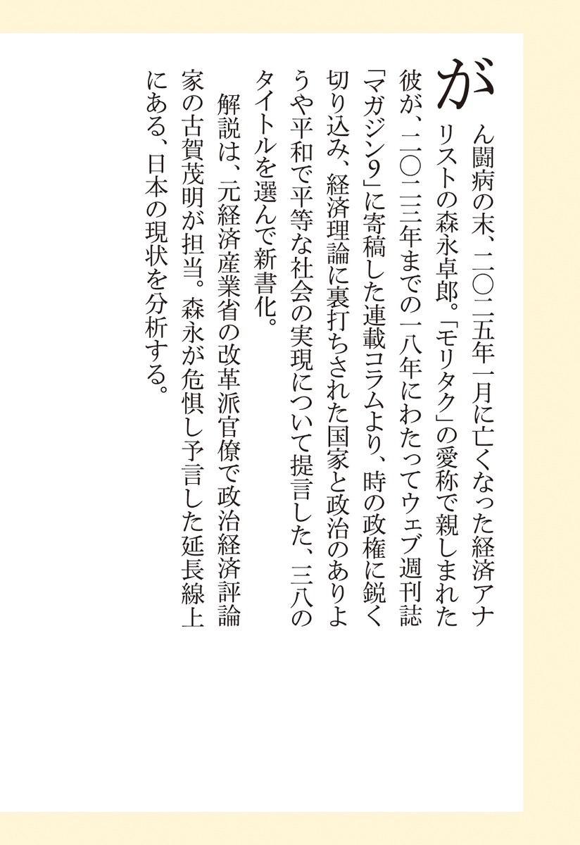 がん闘病の末、2025年に亡くなった経済アナリストの森永卓郎。「モリタク」の愛称で親しまれた彼が2023年までの18年にわたってウェブ週刊誌「マガジン9」に寄稿した連載コラムより、時の政権に切り込み、経済理論に裏打ちされた国家と政治のありようや平和で平等な社会の実現について提言した、38のタイトルを選んで新書化。