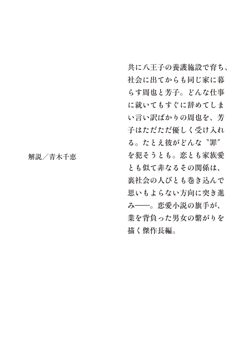 共に八王子の養護施設で育ち、社会に出てからも同じ家に暮らす周也と芳子。どんな仕事に就いてもすぐに辞めてしまい言い訳ばかりの周也を、芳子はただただ優しく受け入れる。たとえ彼がどんな〝罪〟を犯そうとも。恋とも家族愛とも似て非なるその関係は、裏社会の人びとも巻き込んで思いもよらない方向に突き進み──。恋愛小説の旗手が、業を背負った男女の繫がりを描く傑作長編。
