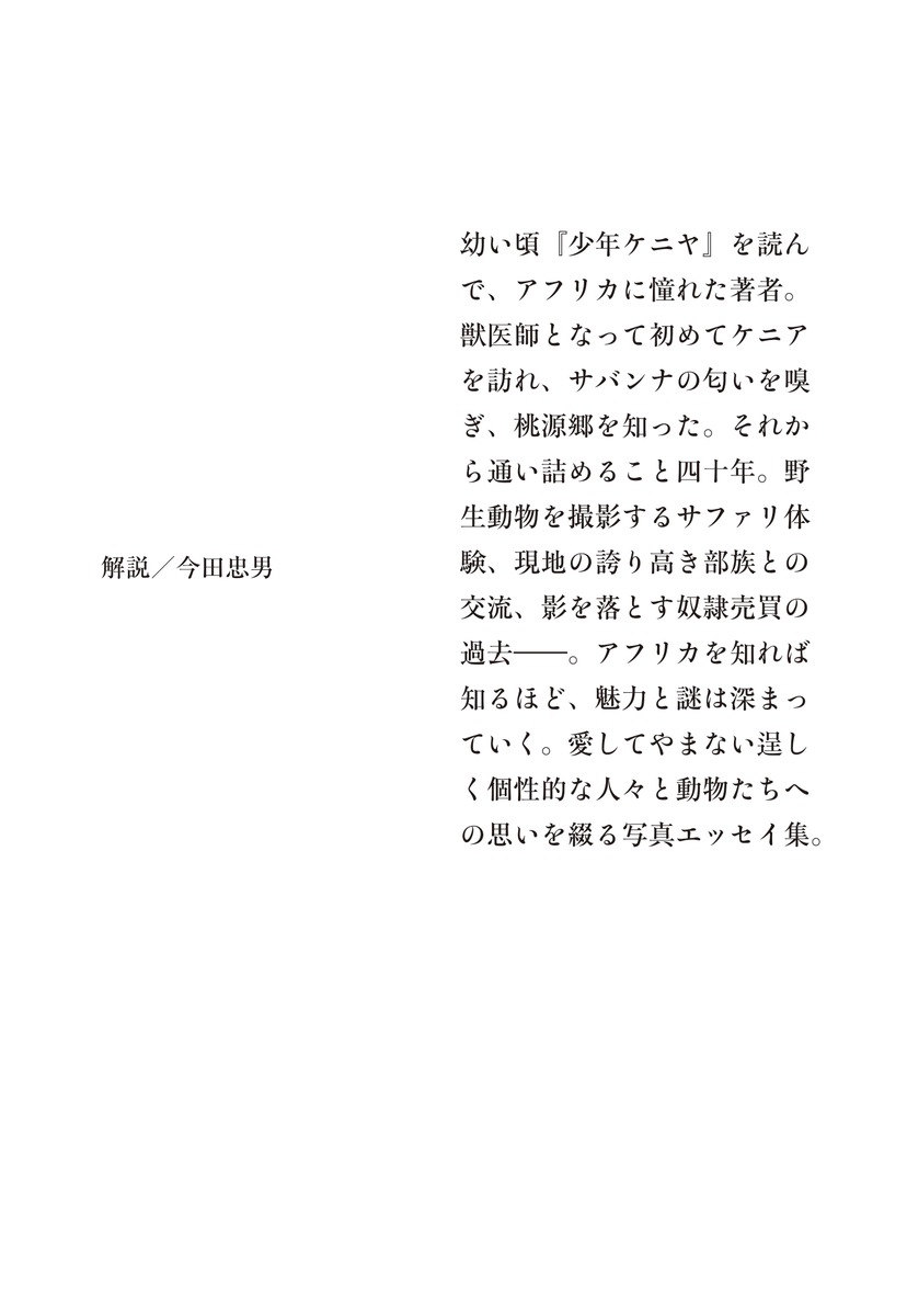 憧れの大地で出会った逞しき人々と、稀有な野生動物たち。獣医師が通い詰めた40年を綴る写真&エッセイ。幼い頃『少年ケニヤ』を読んで、アフリカに憧れた著者。獣医師となって初めてケニアを訪れ、サバンナの匂いを嗅ぎ、桃源郷を知った。それから通い詰めること四十年。野生動物を撮影するサファリ体験、現地の誇り高き部族との交流、影を落とす奴隷売買の過去──。アフリカを知れば知るほど、魅力と謎は深まっていく。愛してやまない逞しく個性的な人々と動物たちへの思いを綴る写真エッセイ集。