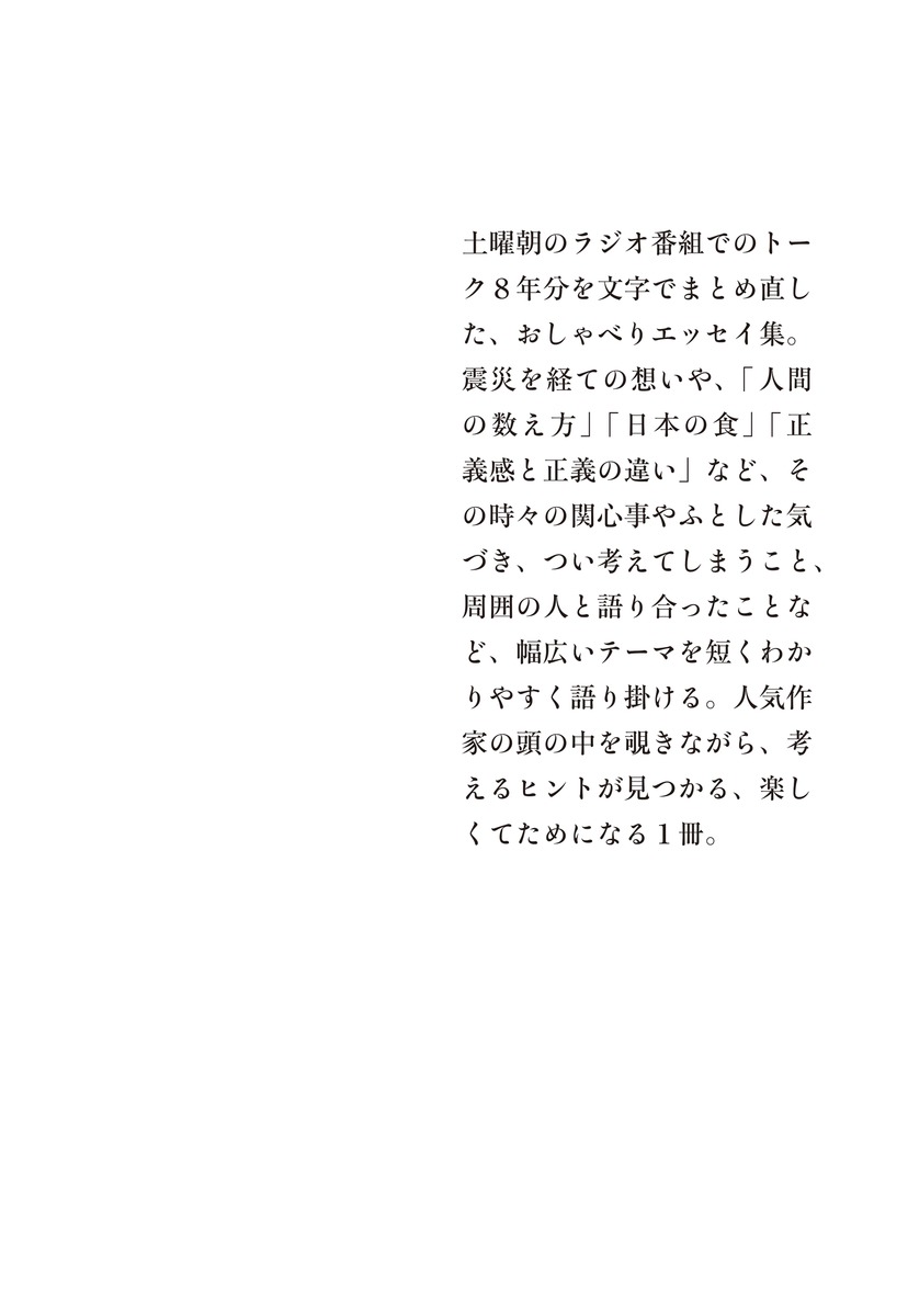 土曜朝のラジオ番組でのトーク8年分を文字でまとめ直した、おしゃべりエッセイ集。震災を経ての想いや、「人間の数え方」「日本の食」「正義感と正義の違い」など、その時々の関心事やふとした気づき、つい考えてしまうこと、周囲の人と語り合ったことなど、幅広いテーマを短くわかりやすく語り掛ける。人気作家の頭の中を覗きながら、考えるヒントが見つかる、楽しくてためになる1冊。