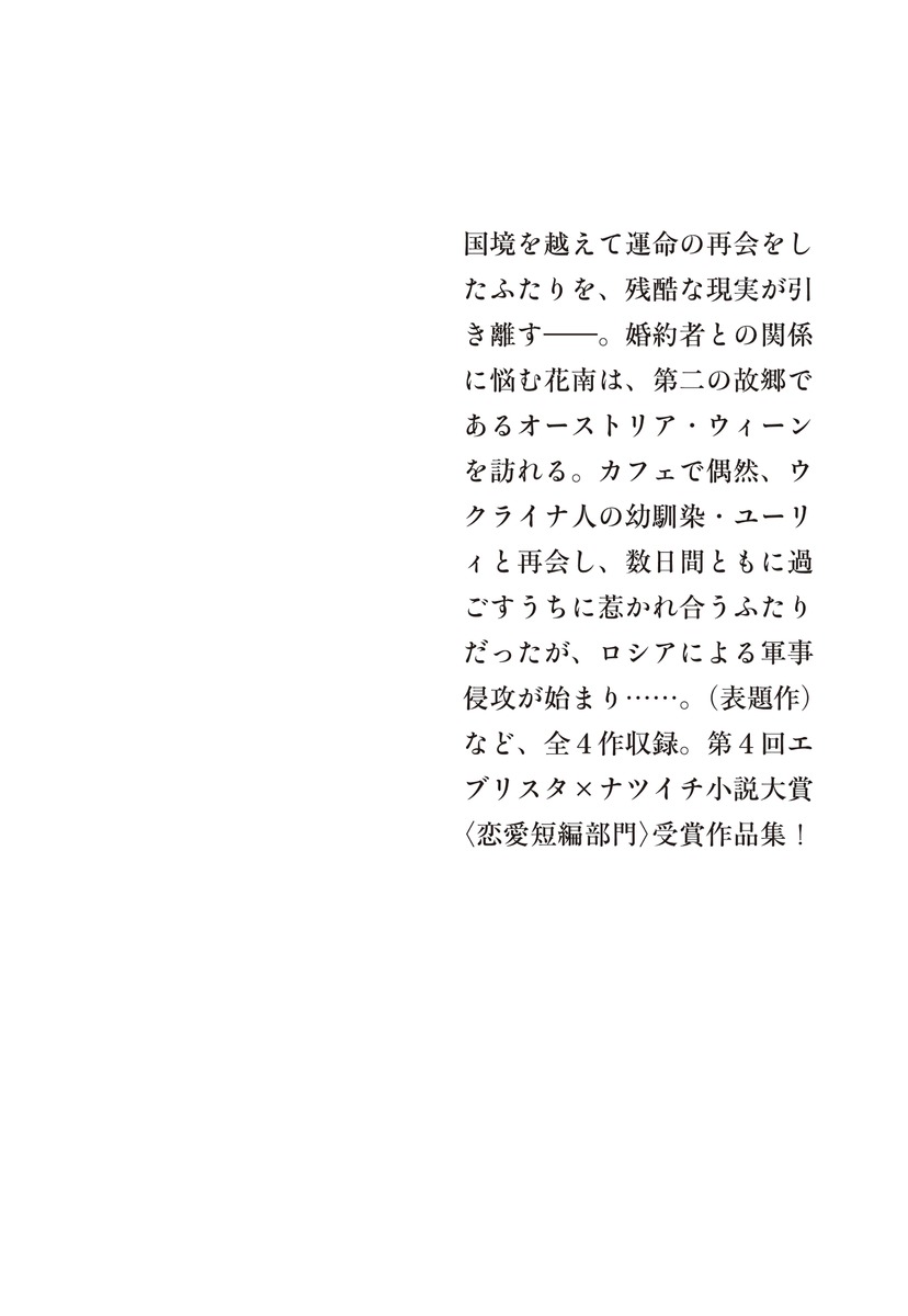 国境を越えて運命の再会をしたふたりを、残酷な現実が引き離す──。婚約者との関係に悩む花南は、第二の故郷であるオーストリア・ウィーンを訪れる。カフェで偶然、ウクライナ人の幼馴染・ユーリィと再会し、数日間ともに過ごすうちに惹かれ合うふたりだったが、ロシアによる軍事侵攻が始まり……。(表題作) など、全4作収録。第4回エブリスタ×ナツイチ小説大賞〈恋愛短編部門〉受賞作品集!