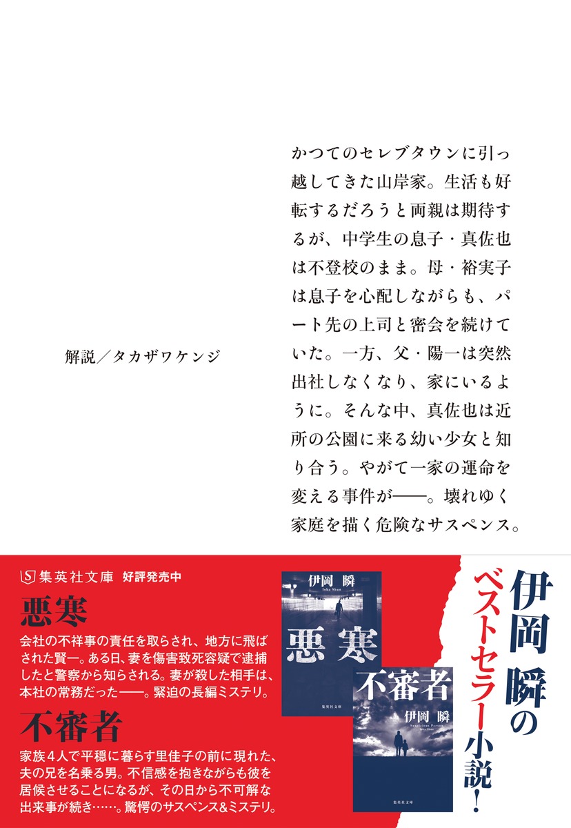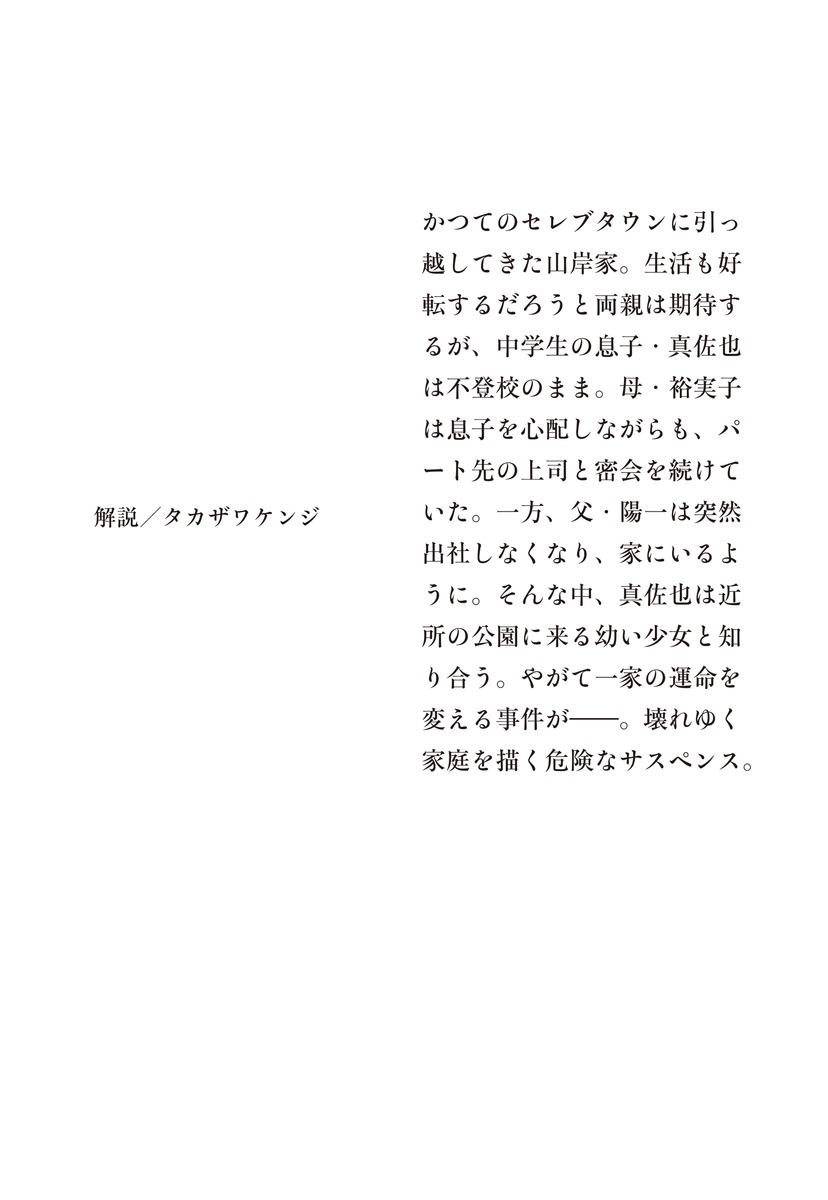 かつてのセレブタウンに引っ越してきた山岸家。生活も好転するだろうと両親は期待するが、中学生の息子・真佐也は不登校のまま。母・裕実子は息子を心配しながらも、パート先の上司と密会を続けていた。一方、父・陽一は突然出社しなくなり、家にいるように。そんな中、真佐也は近所の公園に来る幼い少女と知り合う。やがて一家の運命を変える事件が――。壊れゆく家庭を描く危険なサスペンス。