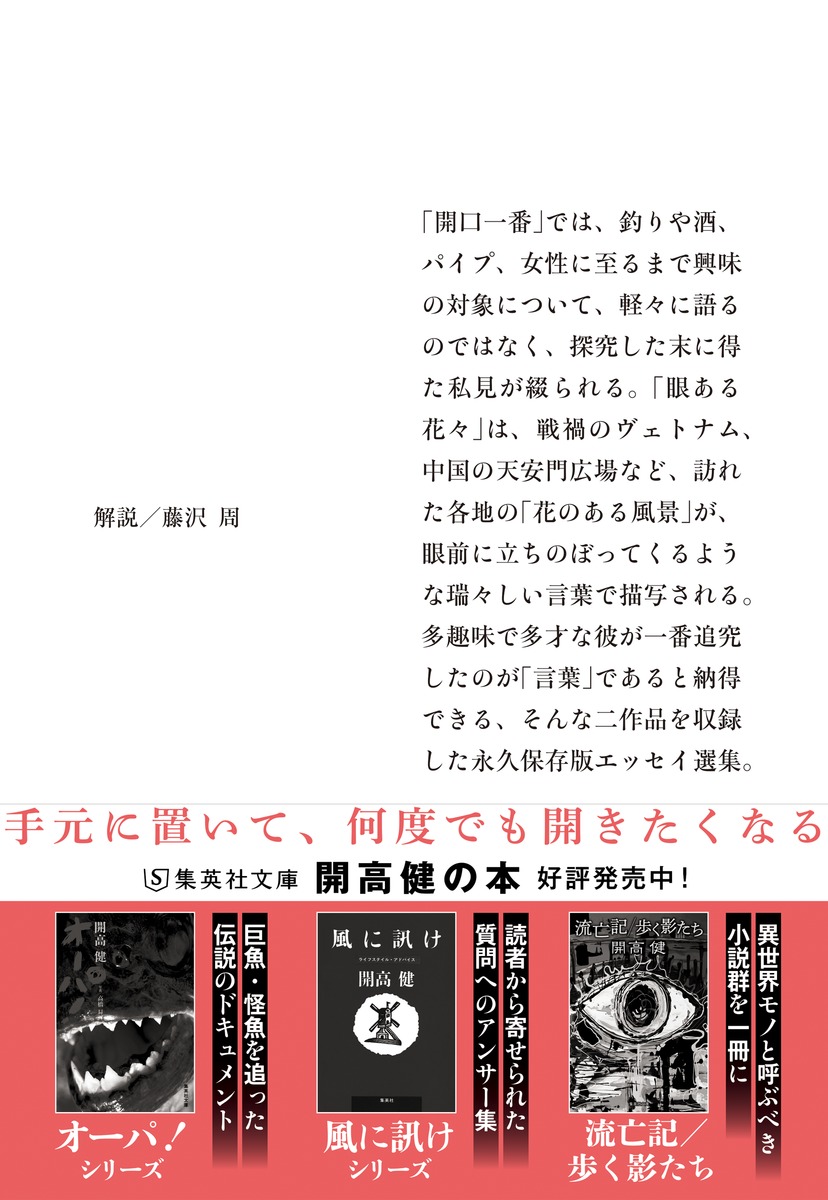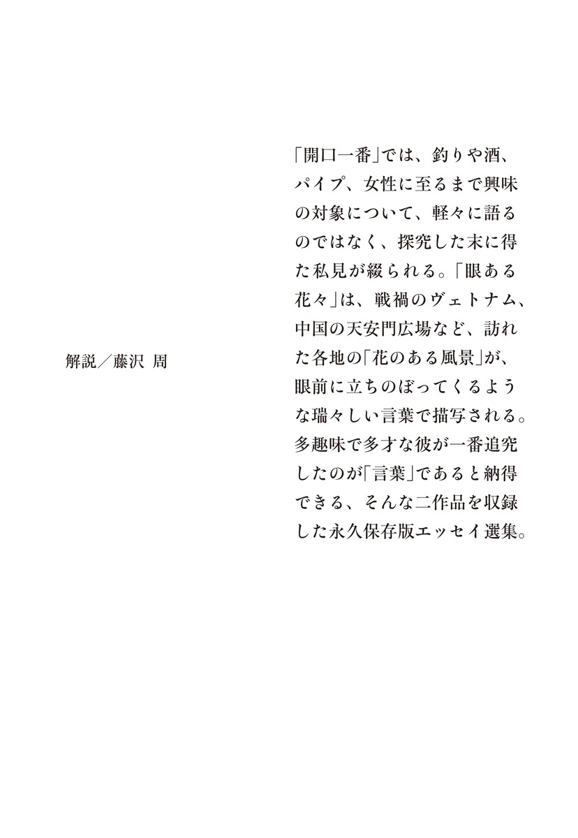 「眼ある花々」は、戦禍のヴェトナム、中国の天安門広場など、訪れた各地の「花のある風景」が、眼前に立ちのぼってくるような瑞々しい言葉で描写される。