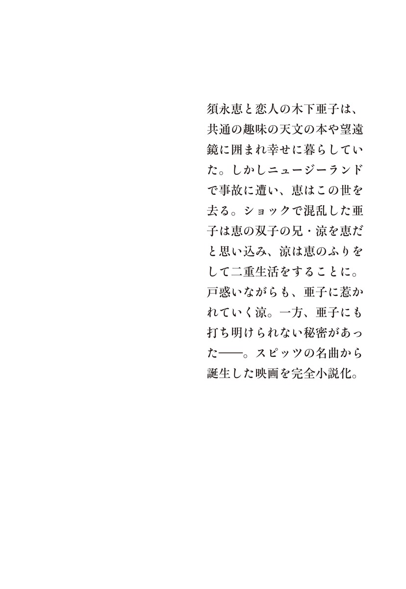須永恵と恋人の木下亜子は、共通の趣味の天文の本や望遠鏡に囲まれ幸せに暮らしていた。