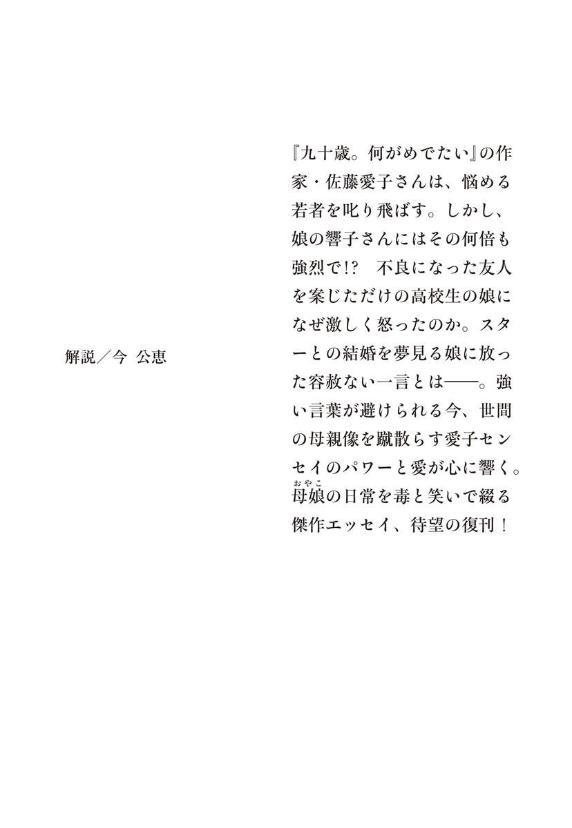 夢見がちな娘×破天荒な母読むと元気が出る“毒と笑い”の母娘エッセイ、待望の復刊!『九十歳。何がめでたい』の作家・佐藤藍子さんは、悩める若者を叱り飛ばす。しかし、娘の響子さんにはその何倍も強烈で!?不良になった友人を案じただけの高校生の娘になぜ激しく怒ったのか。スターとの結婚を夢見る娘に放った容赦ない一言とは――。強い言葉が避けられる今、世間の母親像を蹴散らす愛子センセイのパワーと愛が心に響く。母娘の日常を毒と笑いで綴る傑作エッセイ!