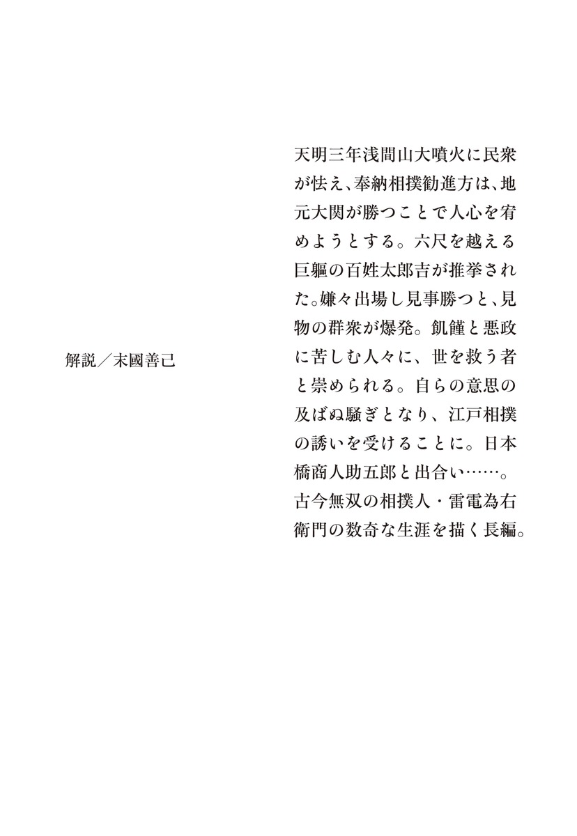 古今無双の相撲人・雷電為右衛門の数奇な生涯を描く長編。