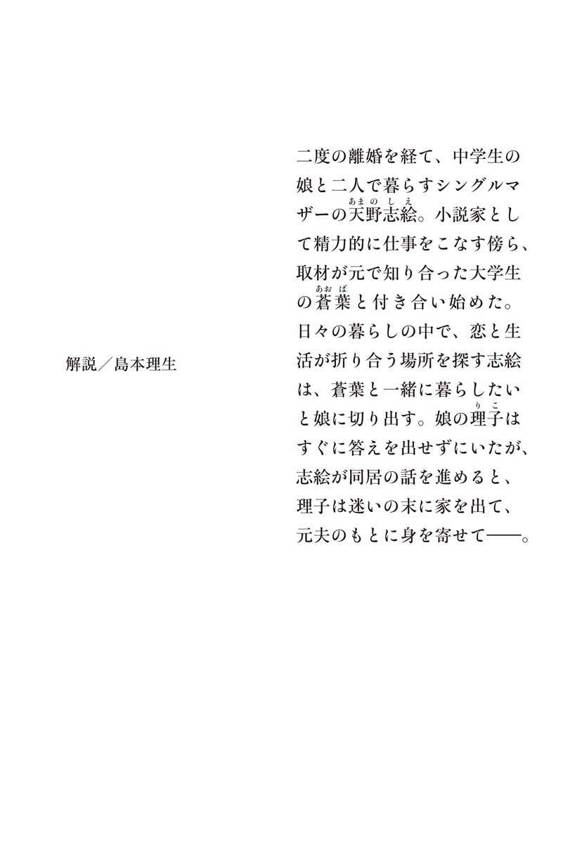 二度の離婚を経て、中学生の娘である理子と二人で暮らすシングルマザーの小説家、志絵。