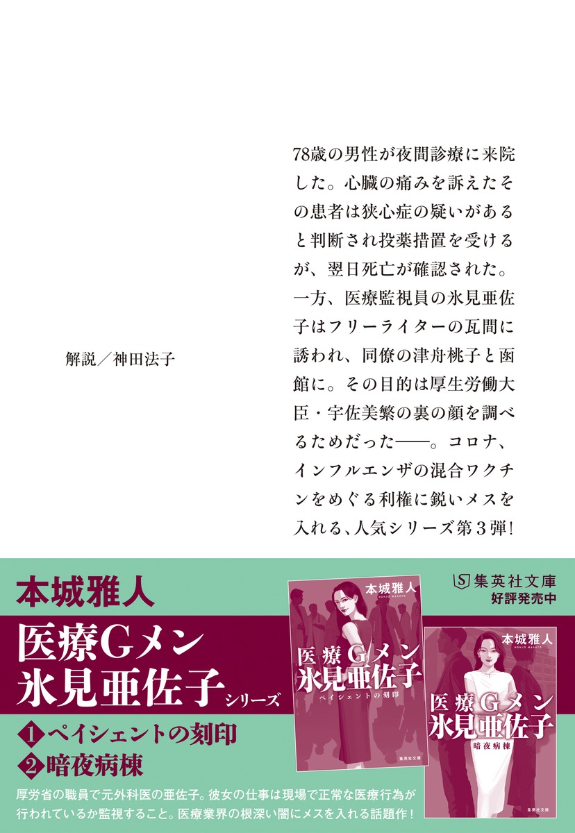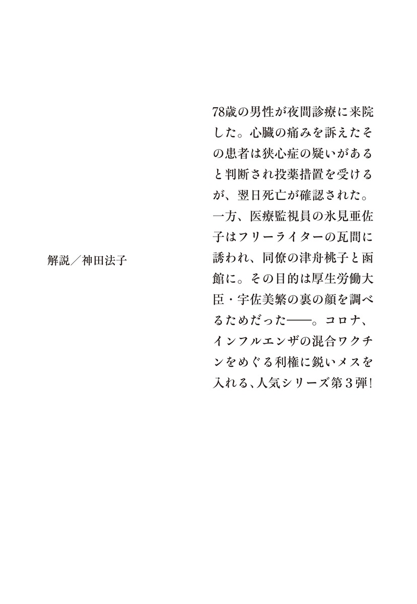 医療の暗部を抉る、大人気シリーズ第3弾コロナとの闘いは、まだ終わらないコロナとインフルエンザの混合ワクチンの治験データをめぐる不正の真相を追え。78再の男性が夜間診療に来院した。心臓の痛みを訴えたその患者は狭心症の疑いがあると判断され投薬措置を受けるが、翌日死亡が確認された。一方、医療監視員の氷見亜佐子はフリーライターの瓦間に誘われ、同僚の津舟桃子と函館に。その目的は厚生労働大臣・宇佐美繁の裏の顔を調べるためだった――。コロナ、インフルエンザの混合ワクチンをめぐる利権に鋭いメスを入れる、大人気シリーズ。