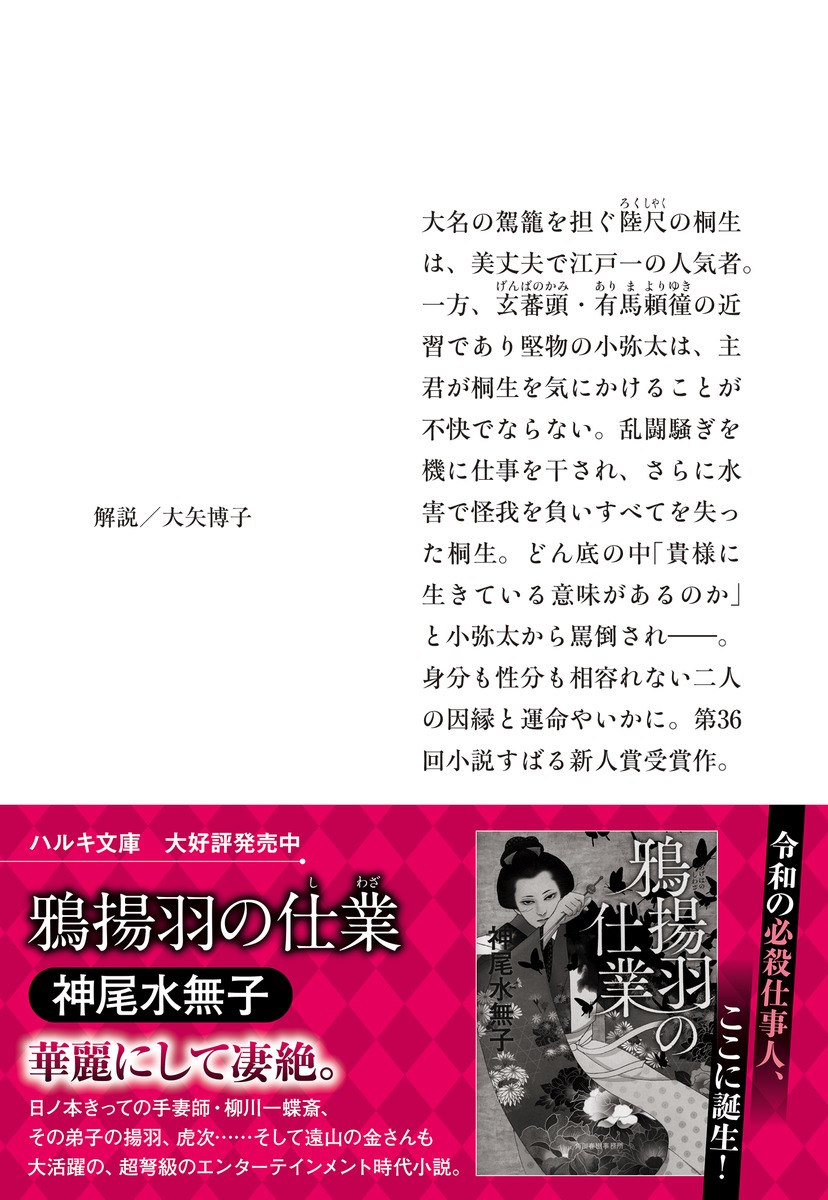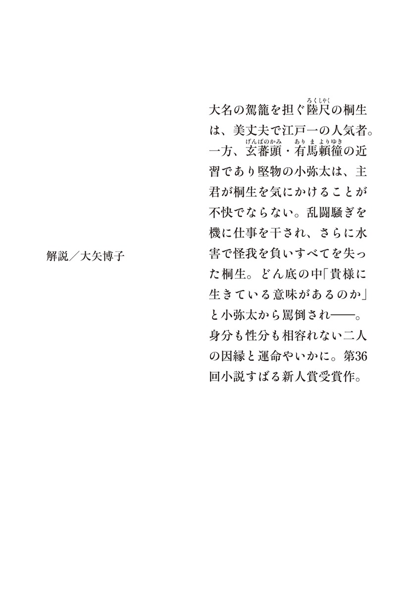 寛保二年。大名や旗本の駕籠を担ぐことを生業とする陸尺の桐生は売れっ子として江戸で人気を誇っていた。ある日、芝居小屋の《市村座》で木戸番と陸尺の大乱闘が勃発。相方の龍太が巻き込まれたと知った桐生は仲間の翔次と共に駆けつける。だが龍太は捕えられ、騒ぎを収めようとしたはずの桐生も結託した仲間に裏切り者扱いされ仕事を干されてしまう。暇を持て余していた八月のある日、大雨により江戸で大洪水が発生。桐生は辛うじて生き延びるも商売道具の右腕に大怪我を負い、かつて恋仲であった娘・おみねも目の前で濁流に呑まれてしまう。何もかも失った桐生は《市村座》の騒動を機に知り合った玄蕃頭・有馬頼徸に救われ屋敷で世話になることになり、懇ろだった深川芸者の粧香とも再会。一方、頼徸の近習である坂西小弥太は、主君が桐生を気に入り、また幼い頃から恋心を抱いていた頼徸の姉・梅渓院までもが執心であることに苛立ちを覚えていた。そして、使い物にならず腐っていた桐生を痛罵し、桐生は有馬家を去るのだが……。