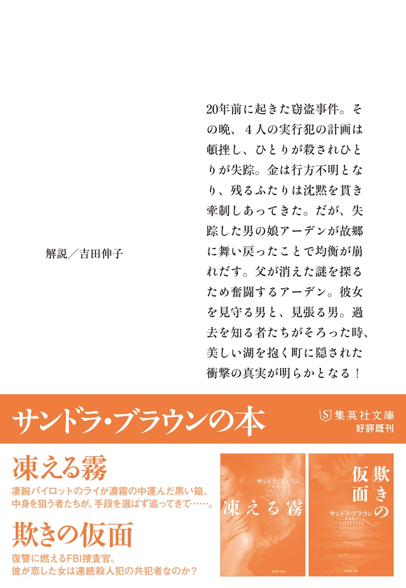 ニューヨーク・タイムズ紙ベストセラー作家、サンドラ・ブラウン作品湖に沈められた驚愕の真実が今浮かび上がる──予測できない衝撃のラスト!20年前に起きた窃盗事件。その晩、4人の実行犯の計画は頓挫し、ひとりが殺されひとりが失踪。金は行方不明となり、残るふたりは沈黙を貫き牽制しあってきた。だが、失踪した男の娘アーデンが故郷に舞い戻ったことで均衡が崩れだす。父が消えた謎を探るため奮闘するアーデン。彼女を見守る男と、見張る男。過去を知る者たちがそろった時、美しい湖を抱く町に隠された衝撃の真実が明らかとなる!