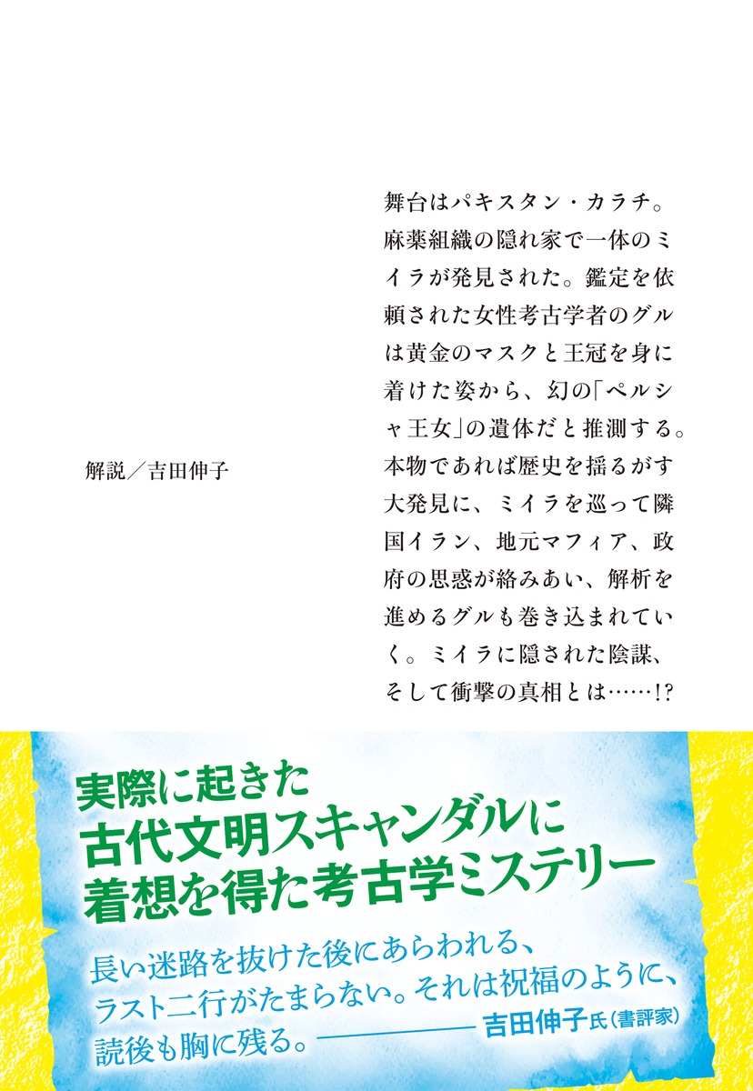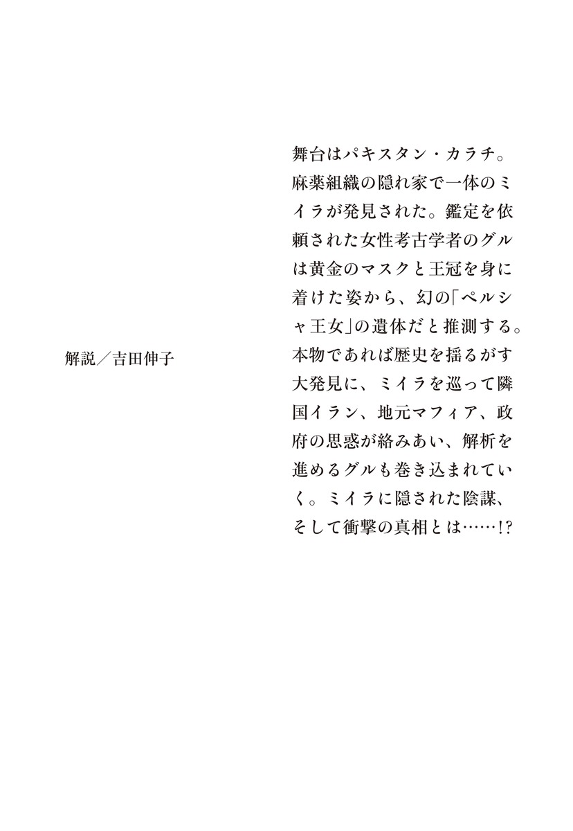 パキスタン史上、前代未聞の大事件!身元不明のミイラの正体は「幻のペルシャ王女」だった――!?秘密、裏切り、陰謀渦巻く壮大な歴史エンタメミステリー舞台はパキスタン・カラチ。麻薬組織の隠れ家で一体のミイラが発見された。鑑定を依頼された女性考古学者のグルは黄金のマスクと王冠を身に着けた姿から、幻の「ペルシャ王女」の遺体だと推測する。本物であれば歴史を揺るがす大発見に、ミイラを巡って隣国イラン、地元マフィア、政府の思惑が絡みあい、解析を進めるグルも巻き込まれていく。ミイラに隠された陰謀、そして衝撃の真相とは……!?