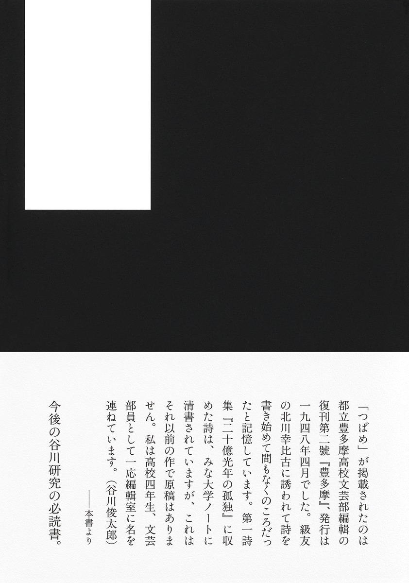 【「つばめ」が掲載されたのは都立豊多摩高校文芸部編輯の復刊第二號『豊多摩』、発行は一九四八年四月でした。級友の北川幸比古に誘われて詩を書き始めて間もなくのころだったと記憶しています。第一詩集『二十億光年の孤独』に収めた詩は、みな大学ノートに清書されていますが、これはそれ以前の作で原稿はありません。私は高校四年生、文芸部員として一応編輯室に名を連ねています。(谷川俊太郎)】――本書より