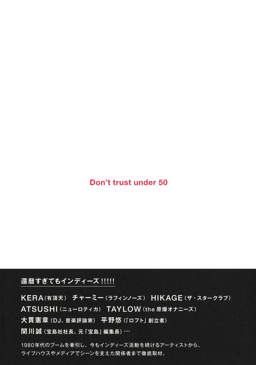 KERA(有頂天)、チャーミー(ラフィンノーズ)、HIKAGE(ザ・スタークラブ)、ATSUSHI(ニューロティカ)、TAYLOW(the 原爆オナニーズ)ら、1980年代に熱狂を生んだブームを牽引し、還暦をすぎた今もインディーズ活動を続けるアーティストから、大貫憲章(DJ、音楽評論家)、平野悠(「ロフト」創立者)、関川誠(宝島社社長、元「宝島」編集長)など、ライブハウスやクラブ、メディアでシーンを支えた関係者まで、10代からパンクに大いなる影響を受けてきた、元「smart」編集長である著者・佐藤誠二朗が徹底取材。日本のパンク・インディーズ史と、なぜ彼らが今もステージに立ち続けることができるのかを問うカルチャーノンフィクション。本論をさらに面白く深く解読するための全11のコラムも収録。