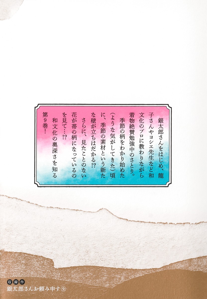 銀太郎さんをはじめ、龍子さんやヨシエ先生など和文化のプロに教わりながら着物絶賛勉強中のさとり。季節の柄をわかり始めた(ような気がしてきた)頃に、季節の素材という新たな壁が立ちはだかる!? さらに、見たことのない花が帯の柄になっているのを見て…!? 和文化の奥深さを知る第9巻!
