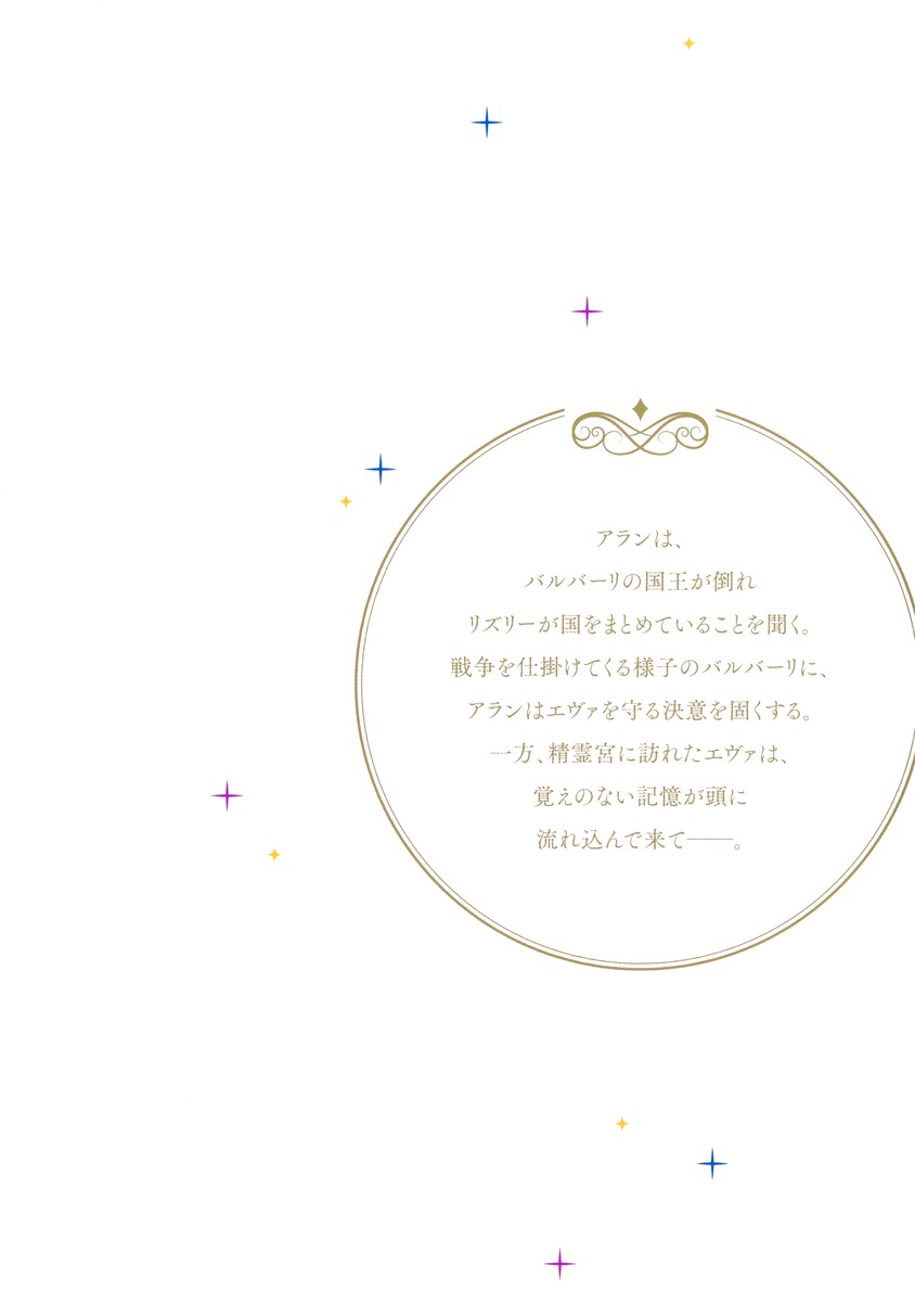 アランは、バルバーリの国王が倒れリズリーが国をまとめていることを聞く。戦争を仕掛けてくる様子のバルバーリに、アランはエヴァを守る決意を固くする。一方、精霊宮に訪れたエヴァは、覚えのない記憶が頭に流れ込んで来て──。