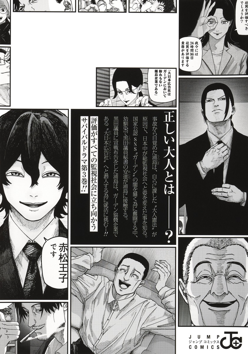 正しい大人とは──?事故から目覚めた浦島は、自らに課した“大人憲法”が原因で、日本中が総監視社会へと姿を変えた事を知る。国家公認SNS“ガーデン”の闇を暴く為に奮闘する中、幼馴染で黒田議員秘書の安達が浦島に接触する。黒田議員に宣戦布告をした浦島は、ガーデン協賛企業である“大日本広告社”へと潜入する為に就活に挑む…!!評価がすべての監視社会に立ち向かうサバイバルドラマ第3巻!!