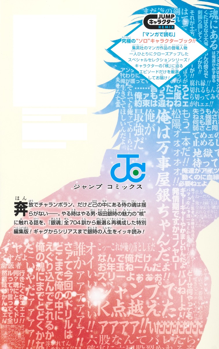 「マンガで読む」究極の“ソロ”キャラクターブック!!集英社のマンガ作品の登場人物一人ひとりにクローズアップしたスペシャルセレクションシリーズ! キャラクターの「核」に迫るエピソードだけを厳選してお届け!奔放でチャランポラン、だけど己の中にある侍の魂は揺らがない──。やる時はやる男・坂田銀時の魅力の“核”に触れる話を、『銀魂』全704訓から厳選&再構成した特別編集版! ギャグからシリアスまで銀時の人生をイッキ読み!