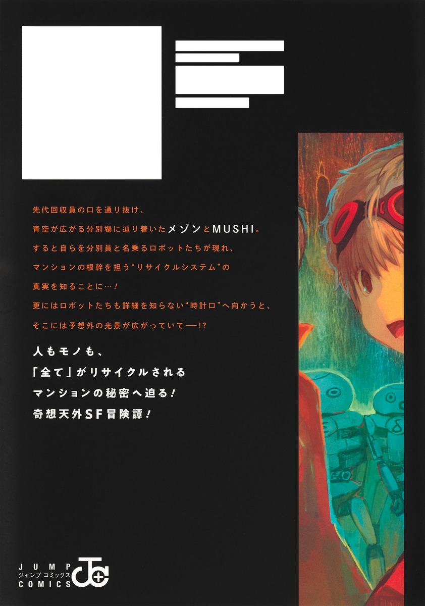 先代回収員の口を通り抜け、青空が広がる分別場に辿り着いたメゾンとMUSHI。すると自らを分別員と名乗るロボットたちが現れ、マンションの根幹を担う“リサイクルシステム”の真実を知ることに…! 更にはロボットたちも詳細を知らない“時計口”へ向かうと、そこには予想外の光景が広がっていて──!?人もモノも、「全て」がリサイクルされるマンションの秘密へ迫る! 奇想天外SF冒険譚!