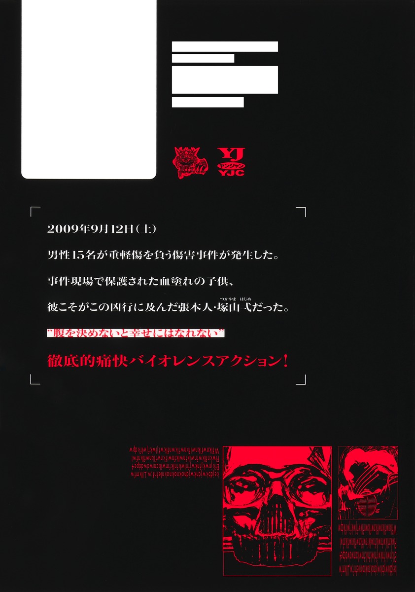 2009年9月12日(土)男性15名が重軽傷を負う傷害事件が発生した。事件現場で保護された血塗れの子供、彼こそがこの凶行に及んだ張本人・塚山弌だった。“腹を決めないと幸せにはなれない”徹底的痛快バイオレンスアクション!