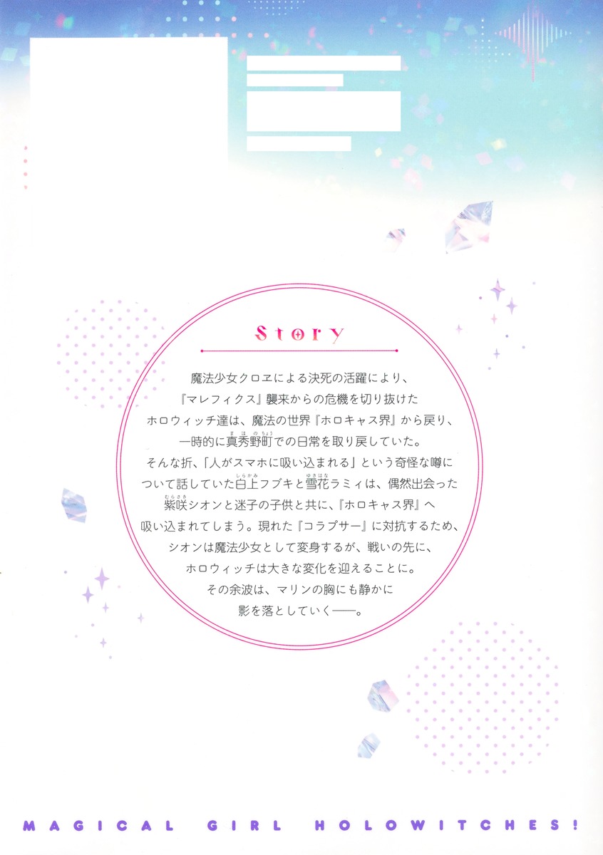 魔法少女クロヱによる決死の活躍により、『マレフィクス』襲来からの危機を切り抜けたホロウィッチ達は、魔法の世界『ホロキャス界』から戻り、一時的に真秀野町での日常を取り戻していた。そんな折、「人がスマホに吸い込まれる」という奇怪な噂について話していた白上フブキと雪花ラミィは、偶然出会った紫咲シオンと迷子の子供と共に、『ホロキャス界』へ吸い込まれてしまう。現れた『コラプサー』に対抗するため、シオンは魔法少女として変身するが、戦いの先に、ホロウィッチは大きな変化を迎えることに。その余波は、マリンの胸にも静かに影を落としていく──。