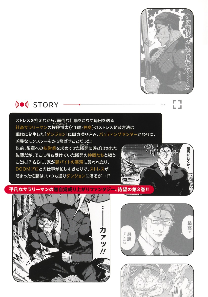 ストレスを抱えながら、面倒な仕事をこなす毎日を送る社畜サラリーマンの佐藤蛍太(さとうけいた)(41歳・独身)のストレス発散方法は現代に発生した「ダンジョン」に単身潜り込み、バッティングセンターがわりに、凶暴なモンスターをかっ飛ばすことだった! 以前、後輩への枕営業を求めてきた勝鬨(かちどき)に呼び出された佐藤だが、そこに待ち受けていた勝鬨の仲間たちと戦うことに!? さらに、家が闇バイトの暴漢に襲われたり、DOOMプロとの仕事が忙しすぎたりで、ストレスが溜まった佐藤は、いつも通りダンジョンに潜るが…!? 平凡なサラリーマンの無自覚成り上がりファンタジー、待望の第3巻!!