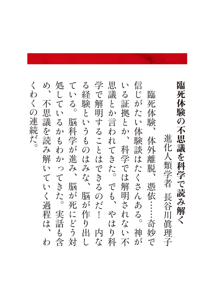 死に直面した人たちの魂が身体を抜け出し、「どこか神々しいところ」に飛んでいくという臨死体験の実態が近年、明らかになってきた。豊富な臨床経験と最新研究から、臨死体験、幽体離脱、金縛り、憑依現象の「メカニズム」を明らかにしていく、スリリングな知的刺激に満ちた1冊。