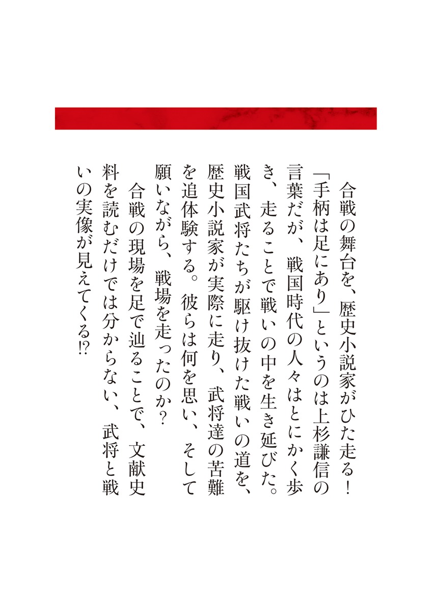 「手柄は足にあり」という上杉謙信の言葉の通り、戦国時代を生きた人々はとにかく歩き、そして走った。戦国武将たちが駆け抜けた戦いの道を、歴史小説家が実際に走り、武将達の苦難を追体験する。彼らは何を思い、そして願いながら、戦場をひた走ったのか? 合戦の現場を足で辿ることで、文献史料を読むだけでは分からない、武将と戦いの実像が見えてくる!?